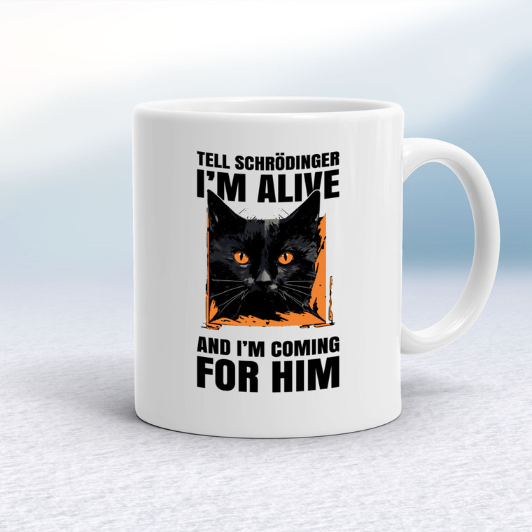 A geeky mug with "Tell Schrödinger I'm Alive And I'm Coming For Him" and an angry black cat printed on both sides.