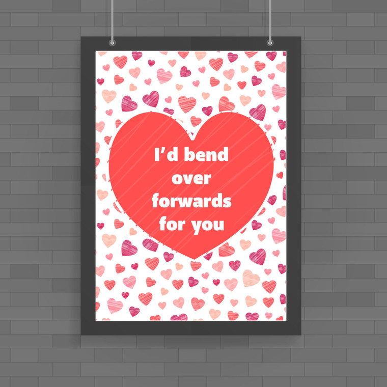 A fantastic addition to any room, this colourful rude poster is a great way to show how much you care! This wall art print, with "I'd Bend Over Forwards For You", will be the centrepiece of any room, great as a gift for any occasion.