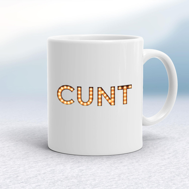 Written in lights! A rude mug with "Cunt" written in a light bulb sign style font printed on both sides.