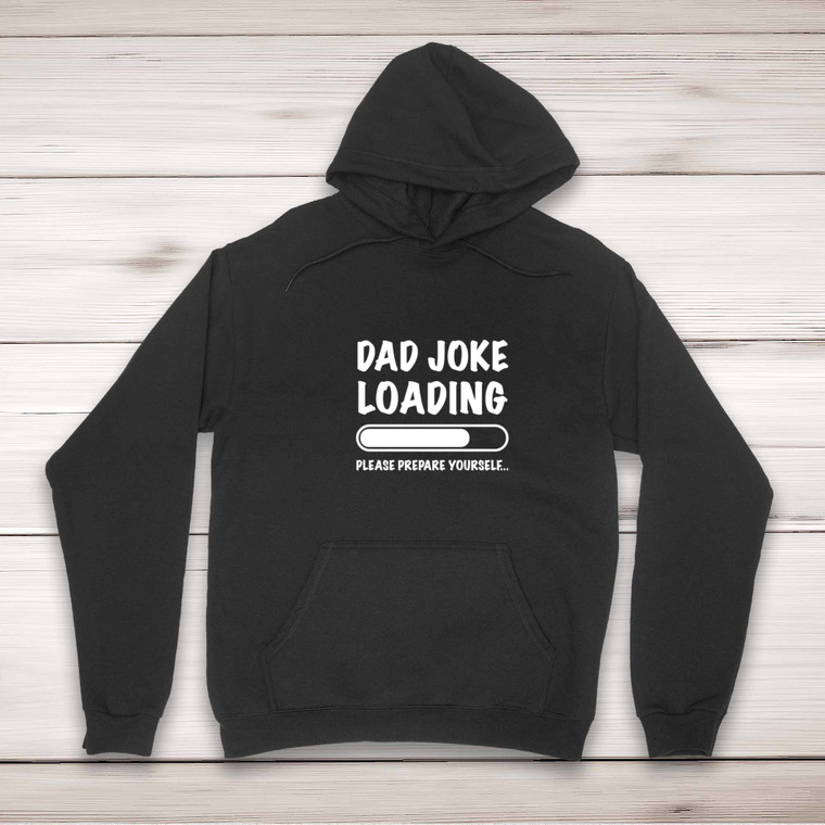 A novelty hoodie with "Dad Joke Loading" printed on the front of a unisex pullover hooded sweatshirt.