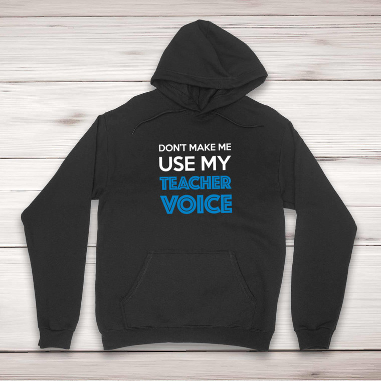A novelty hoodie with "Don't Make Me Use My Teacher Voice" printed on the front of a unisex pullover hooded sweatshirt.