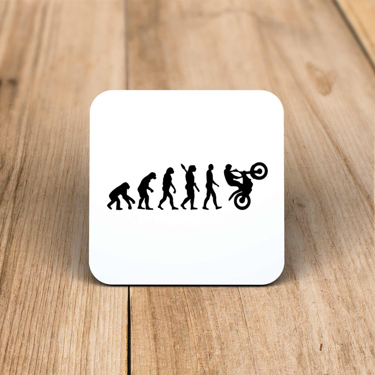 A novelty gift coaster with a progressive evolution graphic finishing with a wheelying trials bike printed on a high gloss coaster. Simple and straight to the point this novelty coaster is great as a gift for any occasion.