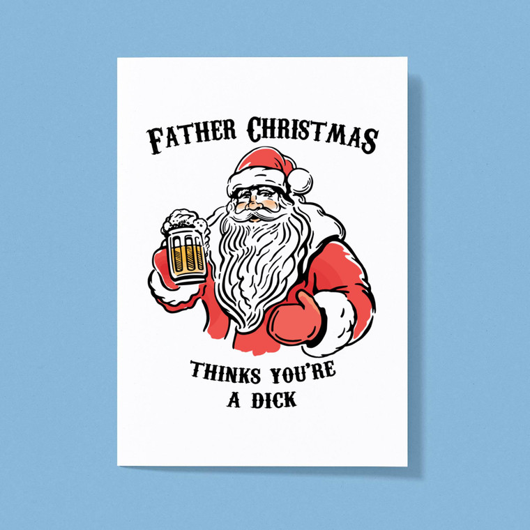 A rude greetings card with "Father Christmas thinks you're a ... " choose from cunt, twat or dick printed on the front. This rude greetings card is great for anyone and ideal for any occasion.