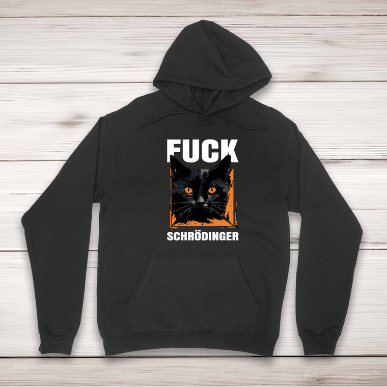 A rude hoodie with "Fuck Schrodinger" printed on the front of a unisex pullover hooded sweatshirt.