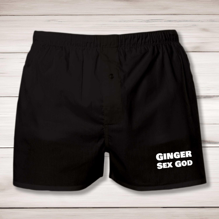 A pair of rude mens classic boxers printed with "Ginger Sex God" on the front.