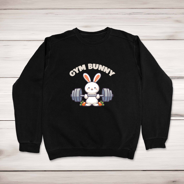 A fantastic, novelty sweatshirt with "Gym Bunny" printed on the front of a unisex sweatshirt.