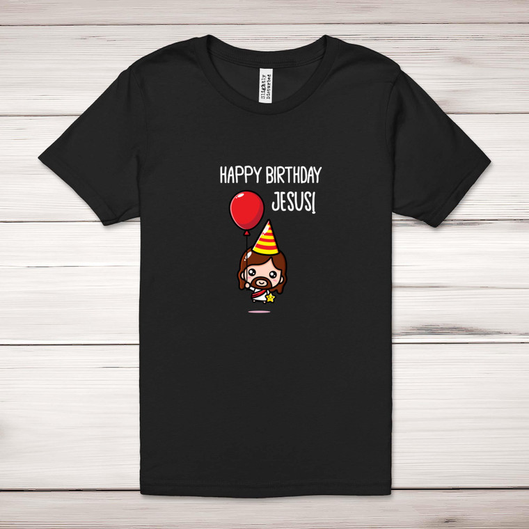 A novelty adult t-shirt with "Happy Birthday Jesus!" printed across the front of a 100% cotton t-shirt.