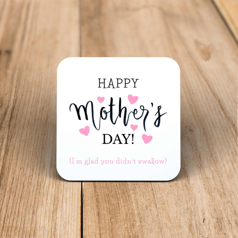 A rude gift coaster with "Happy Mother's Day (I'm Glad You Didn't Swallow)" printed on a high gloss coaster. Simple and straight to the point this rude coaster is great as a gift for any occasion.