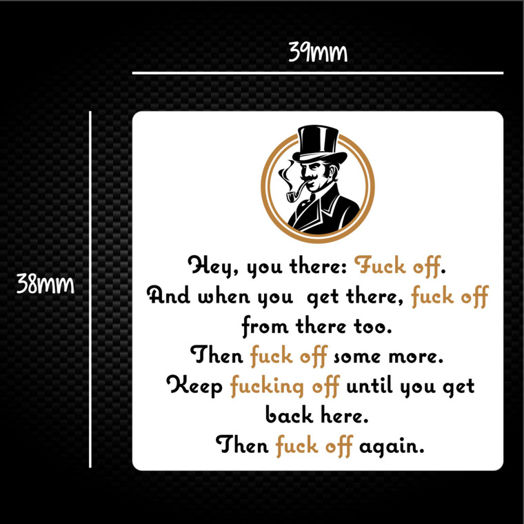 Brighten up any interior flat surface with a fabulous pack of rude stickers, printed with "Hey, you there: Fuck off. And when you get there, fuck off from there too. Then fuck off some more. Keep fucking off until you get back here. Then fuck off again.". Perfect for adding your own touch to anything that a sticker will go on!