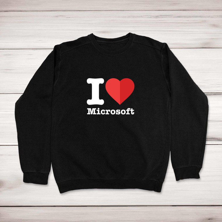A fantastic, geeky sweatshirt with "I Love Microsoft" printed on the front of a unisex sweatshirt. This geeky sweatshirt makes a great gift, perfect for any occasion.