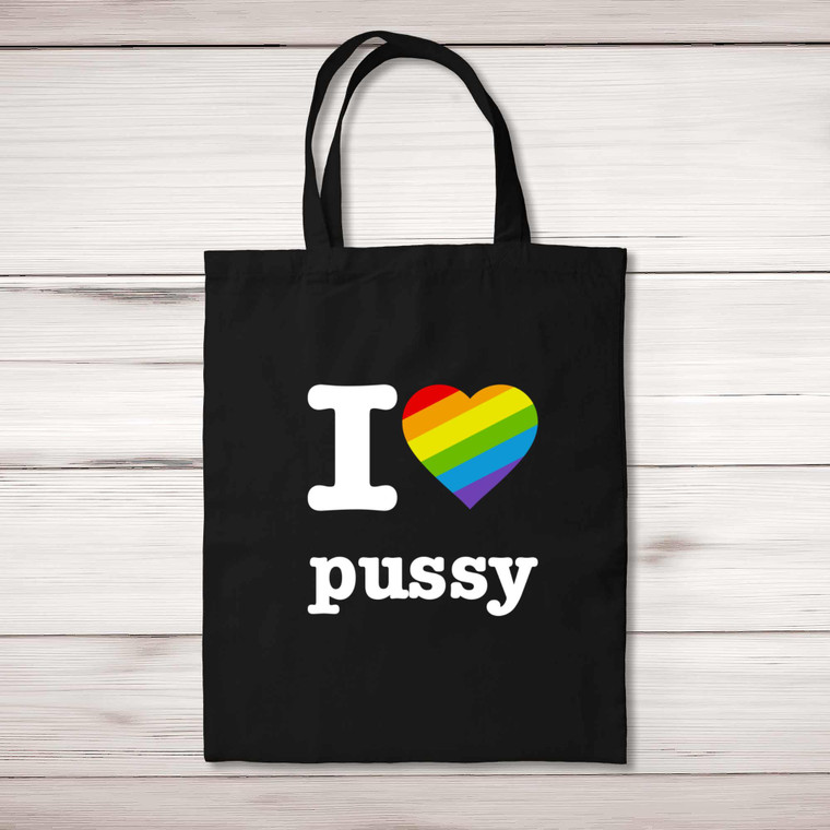A rude shopping bag with "I Love Pussy" with a Pride rainbow heart printed on the front of a 100% cotton tote bag. This rude bag is a perfect replacement for plastic bags in retail, supermarkets and any other kinds of stores. Reusable, sustainable and multifunctional.
