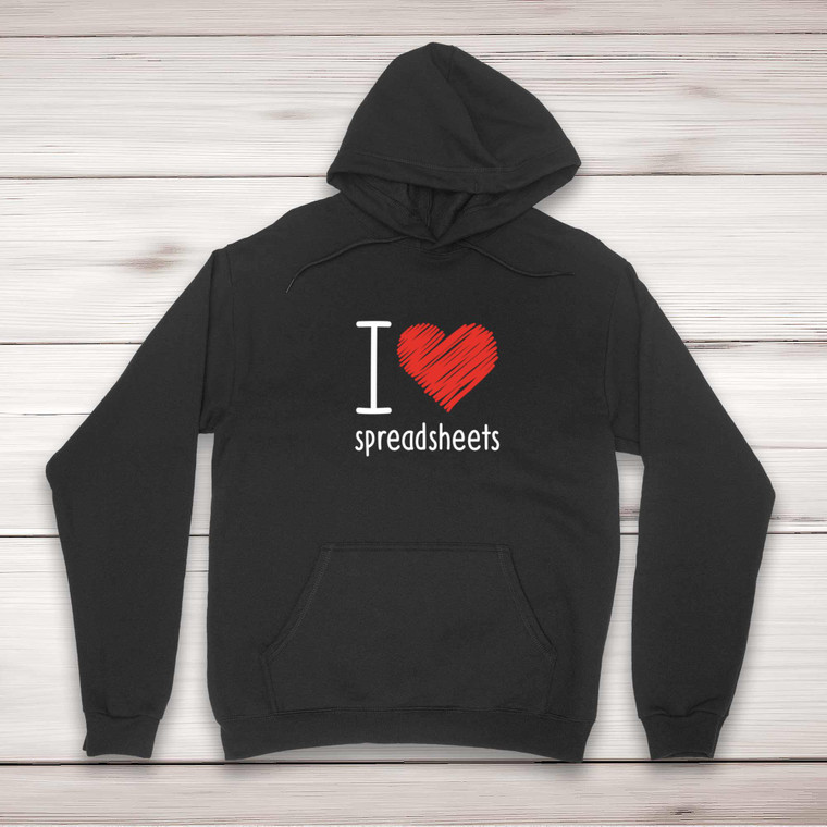 A geeky hoodie with "I Love Spreadsheets" printed on the front of a unisex pullover hooded sweatshirt.