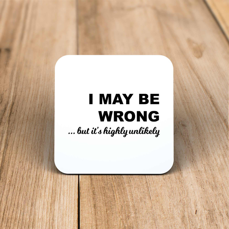 A novelty gift coaster with "I May Be Wrong... But It's Highly Unlikely" printed on a high gloss coaster. Simple and straight to the point this novelty coaster is great as a gift for any occasion.