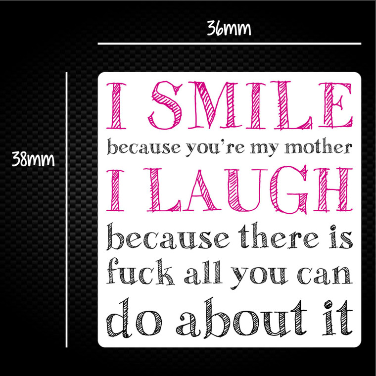 Brighten up any interior flat surface with a fabulous pack of rude stickers, printed with “I Smile Because You’re My Mother I Laugh Because There Is Fuck All You Can Do About It” or you can also choose sister or daughter. Perfect for adding your own touch to anything that a sticker will go on!