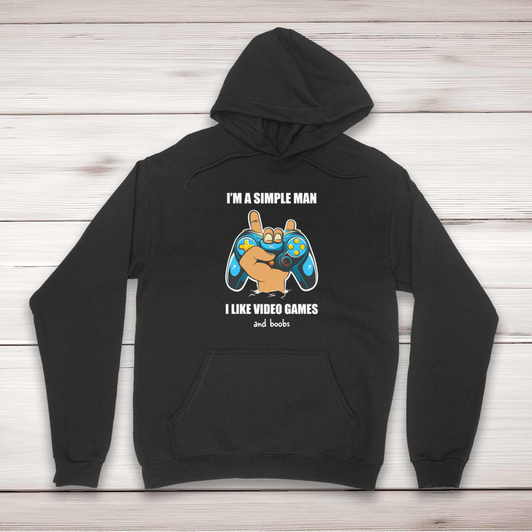 A rude hoodie with "I'm A Simple Man I iIke Video Games and boobs" printed on the front of a unisex pullover hooded sweatshirt.