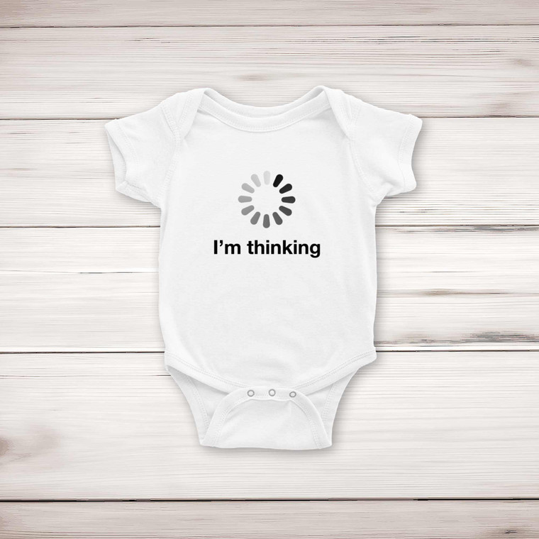 Super soft and stretchy 100% cotton, short sleeve, babygrow / romper suit / sleepsuit with poppers for ease of dressing. Printed with "I'm Thinking" and a loading graphic across the front of the garment.