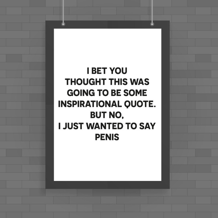 A fantastic addition to any room, this colourful rude poster is a great way to show how much you care! This wall art print, with "I Bet You Thought This Was Going To Be Some Inspirational Quote. But No, I Just Wanted To Say Penis ", will be the centrepiece of any room, great as a gift for any occasion.