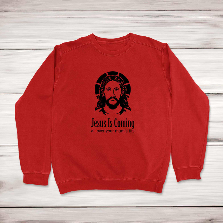 A fantastic, rude sweatshirt with "Jesus Is Coming all over your mum’s tits" printed on the front of a unisex sweatshirt.