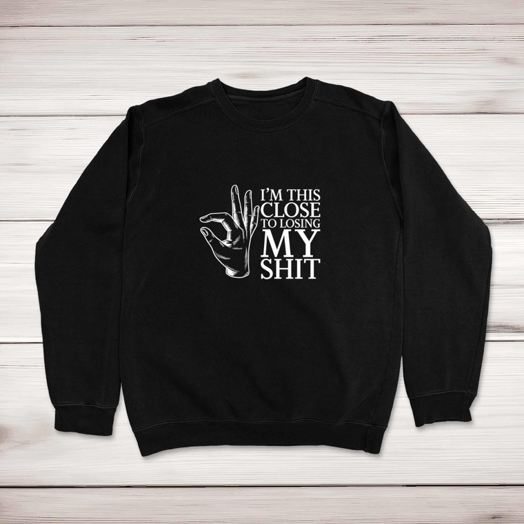A fantastic, rude sweatshirt with "I'm This Close To Losing My Shit" printed on the front of a unisex sweatshirt.