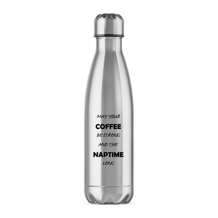 Stay hydrated in style with this novelty water bottle with "May Your Coffee Be Strong And The Naptime Long" printed on both sides. This novelty water bottle is perfect for keeping your favourite beverages at just the right temperature in any weather.