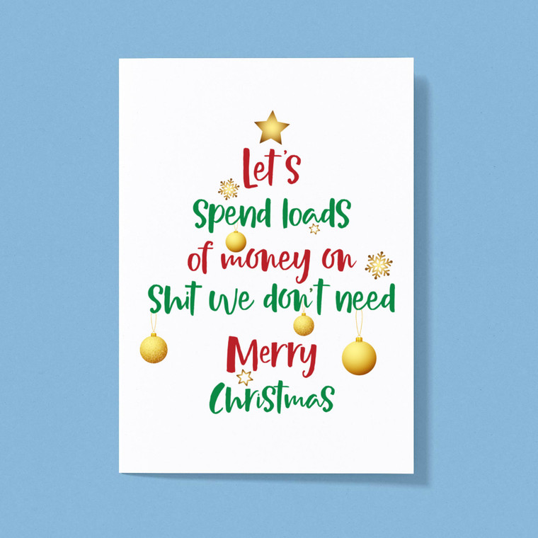 A rude greetings card with "Let's Spend Loads Of Money On Shit We Don't Need. Merry Christmas" printed on the front. This rude greetings card is great for anyone and ideal for any occasion.