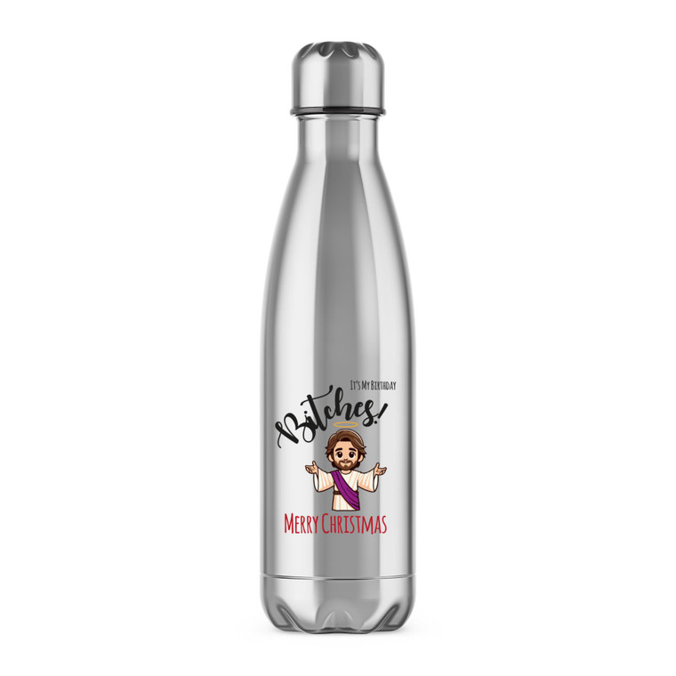 Stay hydrated in style with this rude water bottle with "It's My Birthday Bitches Merry Christmas" and a Jesus like figure printed on both sides. This rude water bottle is perfect for keeping your favourite beverages at just the right temperature in any weather.