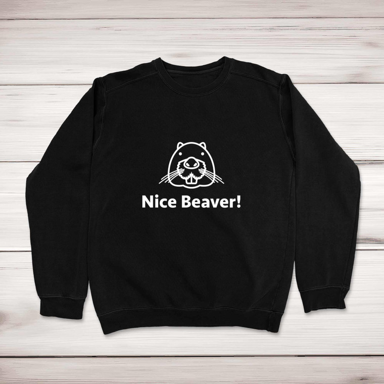 A fantastic, novelty sweatshirt with a cute beaver outline graphic and "Nice Beaver!" printed on the front of a unisex sweatshirt.