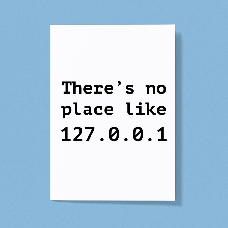 A geeky greetings card with "There's No Place Like 127.0.0.1" printed on the front. This geeky greetings card is great for anyone and ideal for any occasion.