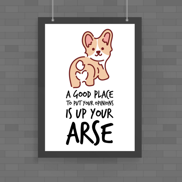 A fantastic addition to any room, this colourful rude poster is a great way to show how much you care! This wall art print, with "A Good Place To Put Your Opinions Is Up Your Arse", will be the centrepiece of any room, great as a gift for any occasion.