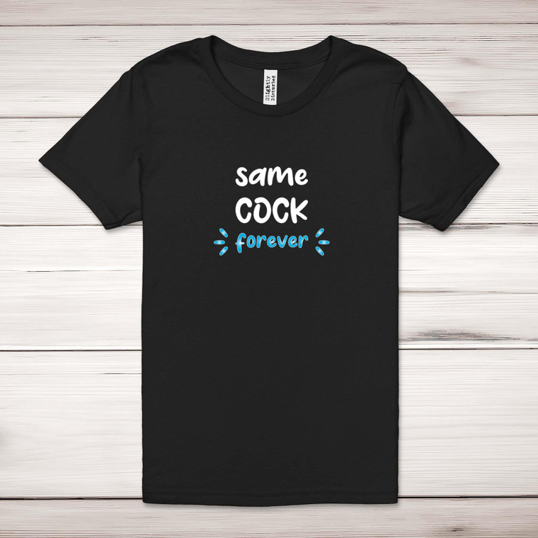 A rude adult t-shirt with "Same Cock Forever" printed across the front of a 100% cotton t-shirt.