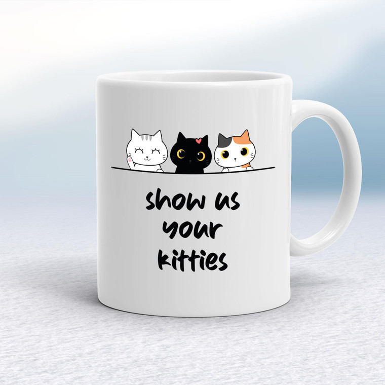 A novelty mug with "Show Us Your Kitties" printed on both sides.