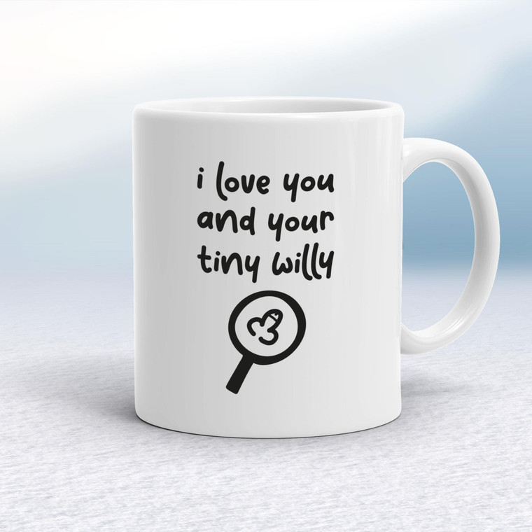 A rude mug with "I Love You And Your Tiny Willy" printed on both sides.