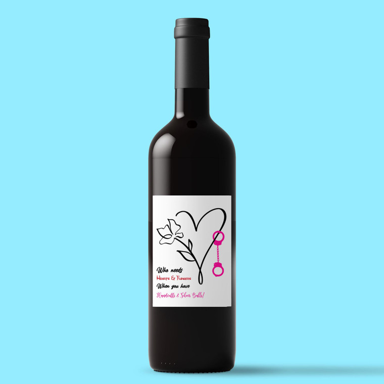 Transform their favourite bottle of the good stuff by adding you own rude label printed with "Who Needs Hearts And Flowers When You Have Handcuffs and Silver Balls" to make a truly unique gift. Bottles with rude labels make an excellent centrepiece for any special occasion!