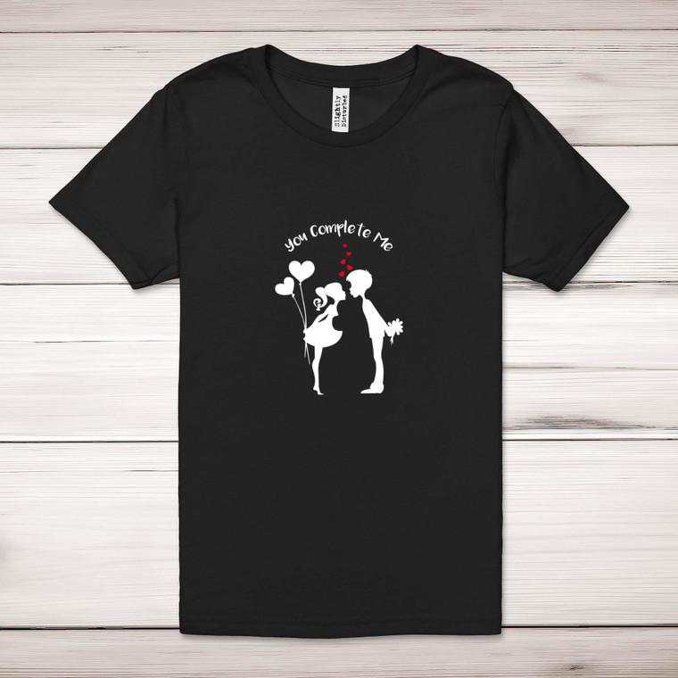 A novelty adult t-shirt with "You Complete Me" printed across the front of a 100% cotton t-shirt.