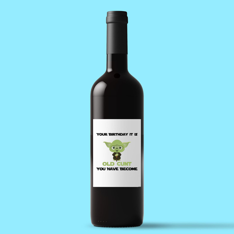 Transform their favourite bottle of the good stuff by adding you own rude label printed with a cute Yoda graphic and the phrase Your Birthday It Is, Old Cunt You Have Become to make a truly unique gift. Bottles with rude labels make an excellent centrepiece for any special occasion!